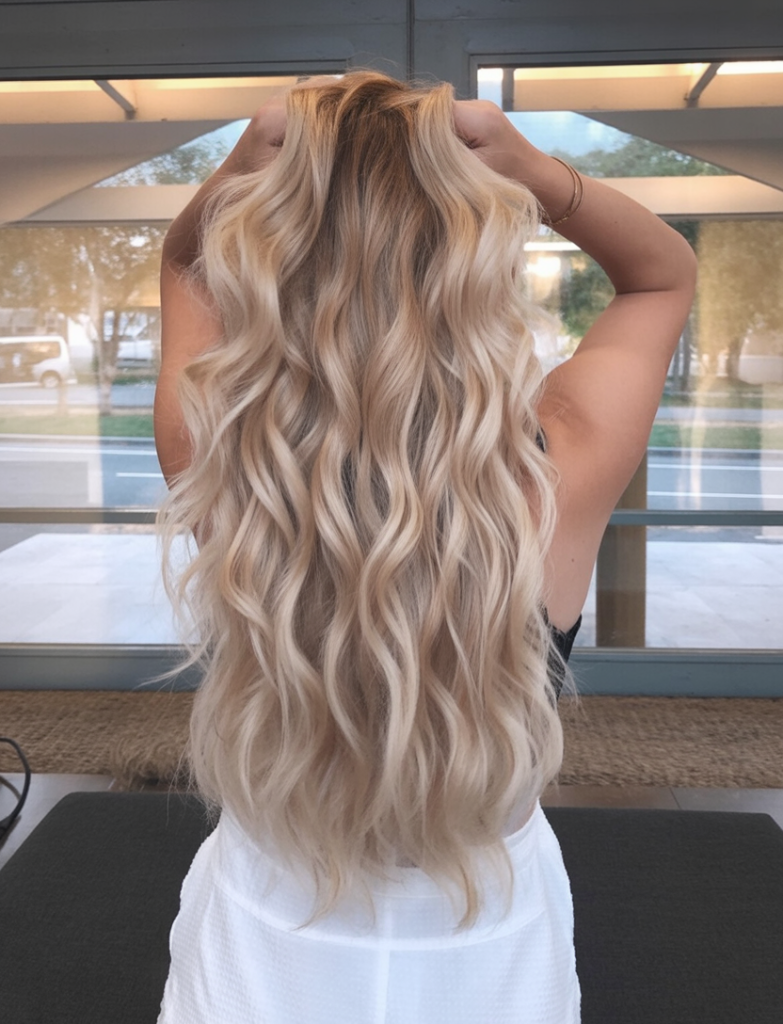 A dream of light hair enthusiasts, these locks with dirty blonde roots and full blonde highlights are washed with shimmer on every shake. The waves increase the bounce and liveliness bringing the color to make it radiant and glamorous. It can be worn in the evenings but also during daytime.