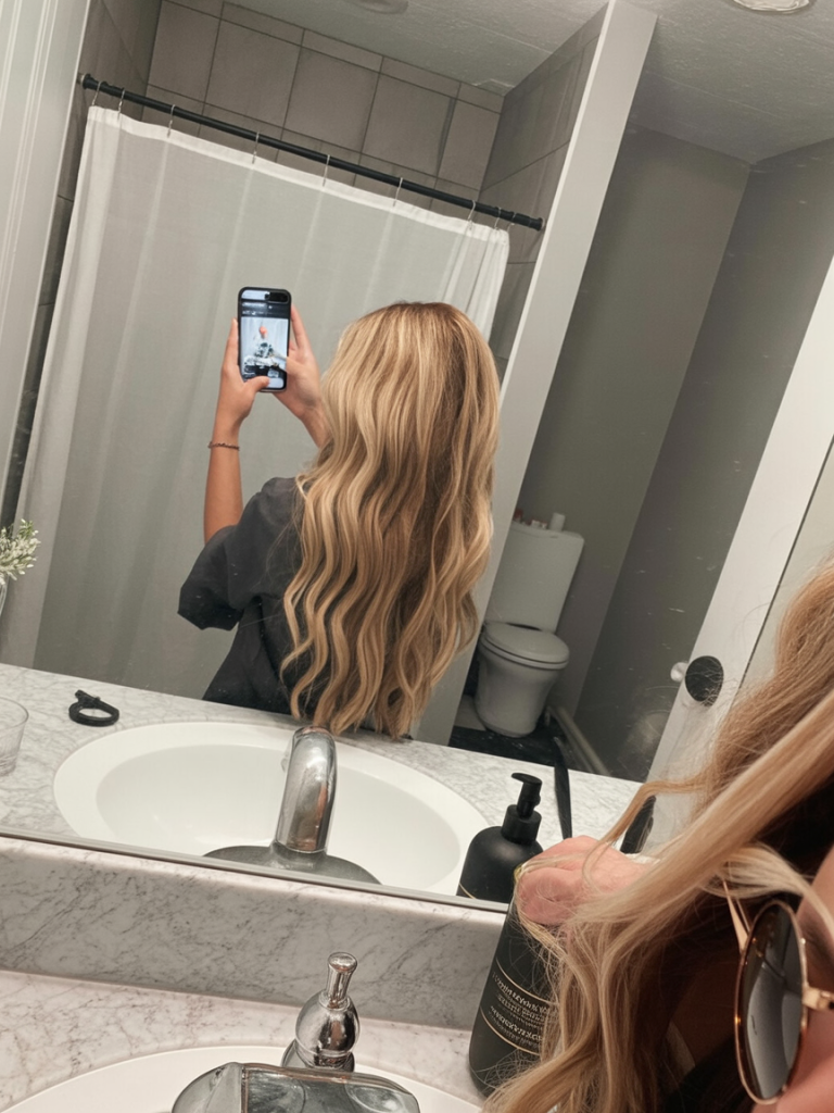 There is a sense of bottled sunshine in this style- soft, golden, balayage woven into dirty blonde hair. The wavy texture also makes it the most relaxed look that is more romantic and effortless. It’s relaxed, natural, and flattering for all ages.