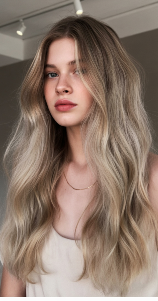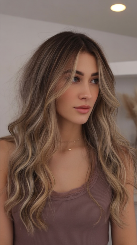 A wavy dirty blonde always looks casually chic, and the hair is brightened with subtle baby lights and the hair is darkened at the root. The outcome is a comfortable mixed with warm feeling of a sunlit style that is relaxed but sophisticated. It is this happy medium between low-key and fancy like you could wear it for brunch and a wedding.