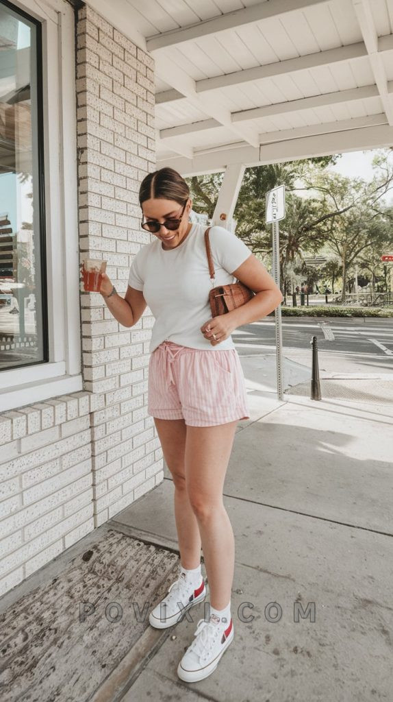 A white fitted tee paired with striped pink drawstring shorts creates a fun and sporty vibe. This look is ideal for casual comfy days when you want to stay stylish yet relaxed. The chunky white sneakers with red detailing add a retro flair, making this a perfect for school or a weekend errand run. The high-waisted shorts elongate the legs, while the cropped tee enhances the waistline for a flattering silhouette. Add gold jewelry and oversized sunglasses for a modern touch, and throw on a lightweight denim jacket for cooler evenings.