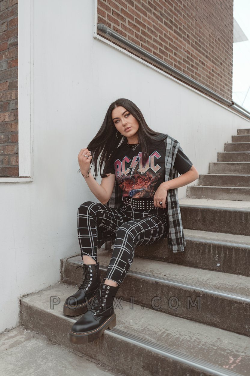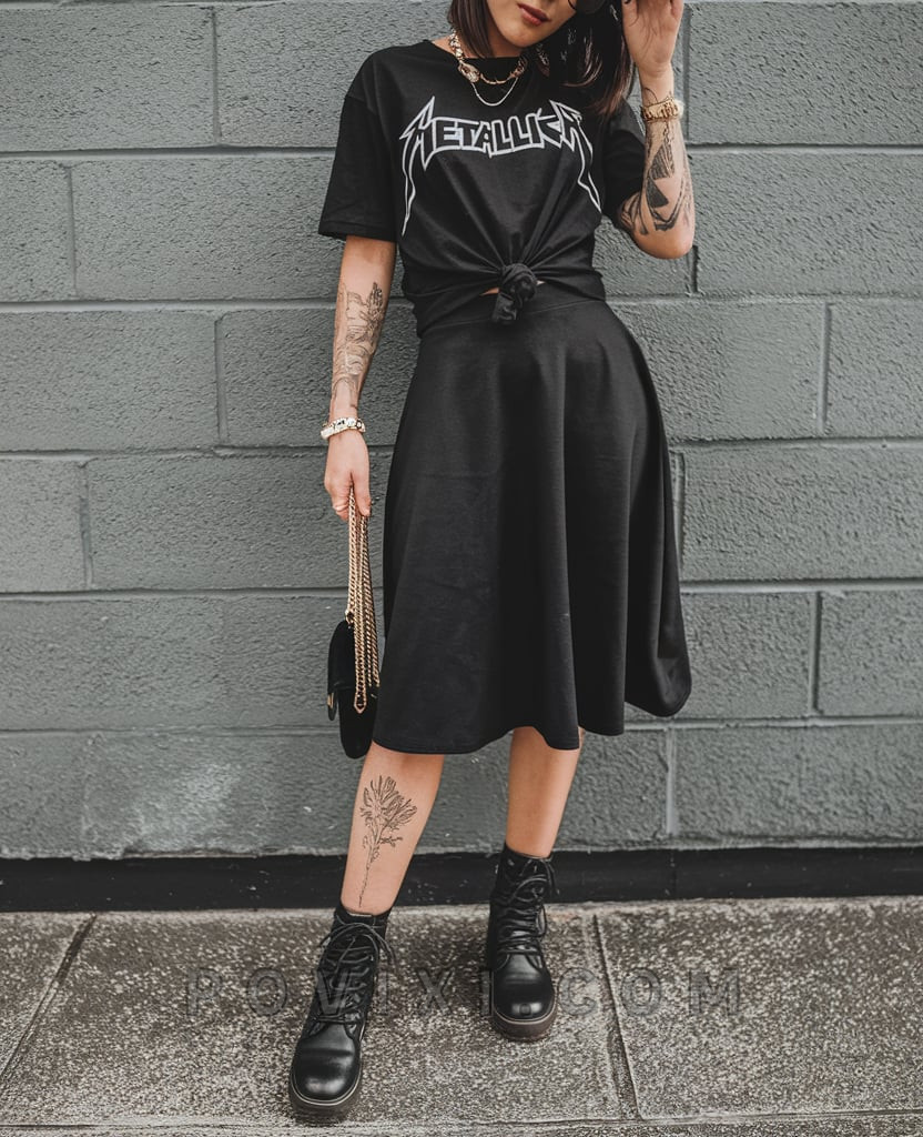 This look is a confident blend of street and casual goth. A black Metallica tee tucked into a belted, high-waisted midi skirt plays with soft and edgy contrasts. Combat boots with heavy soles give it a punk base, while the subtle leg slit adds just the right touch of romantic rebellion. Paired with layered necklaces, tattoos, and a crossbody bag, it’s perfect for girls who like to blur the line between music culture and aesthetic fashion. Try this look when you’re heading to brunch or a local art show.