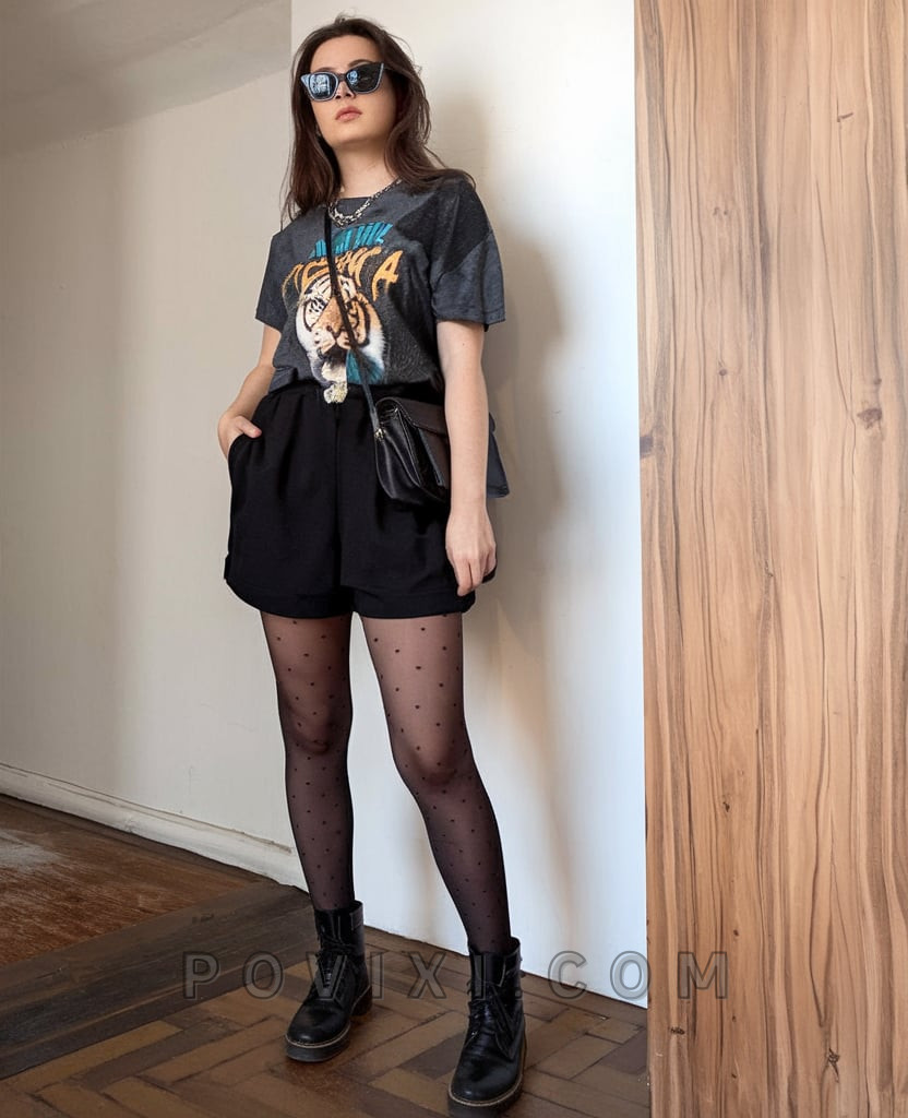 This is your go-to outfit for running errands or sipping iced coffee on a sunny day while still staying on-brand. The lazy, laid-back vibe comes from a graphic tee and cuffed black shorts, while the polka-dot tights and combat boots keep things fun and slightly rebellious. A plus size-friendly ensemble, it emphasizes comfort and cuteness without compromising identity. Add some sunnies and a crossbody for a ready-to-roll look.
