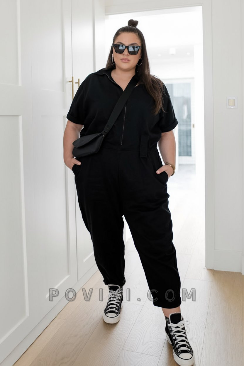 Proof that goth can be casual, clean, and incredibly wearable. This look features a black jumpsuit with a relaxed silhouette, styled with classic Converse sneakers and a crossbody bag for lazy days or errands with edge. The oversized sunglasses and hoop earrings add a touch of glam, making this outfit an excellent choice for plus size women who want comfort without compromising on attitude. It’s minimal, modern, and totally street-ready.