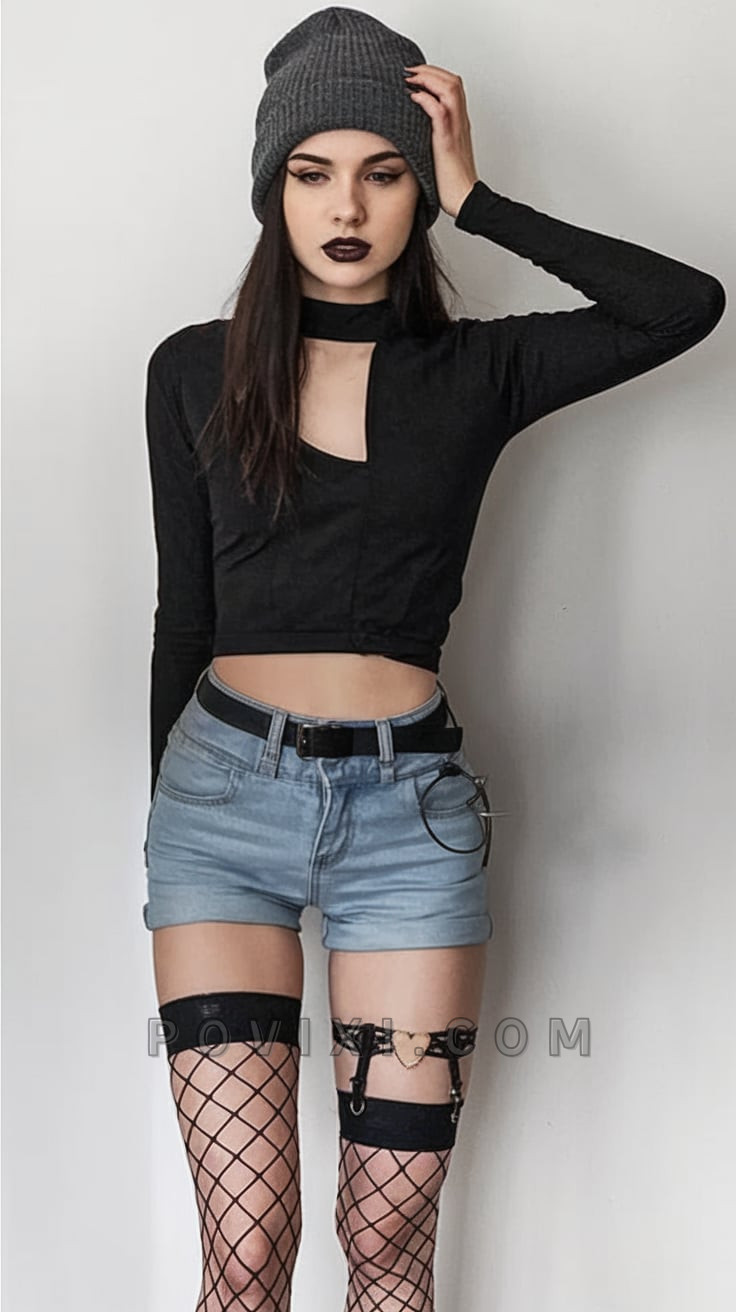 Ideal for summer, this look features light denim shorts, a black crop top, and iconic fishnet thigh-highs with a bold heart-shaped garter. The knit beanie and dark lipstick pull the whole grunge-inspired look together. It’s playful, hot, and confident—a little flirt, a little punk. Perfect for casual nights out or alternative music festivals.