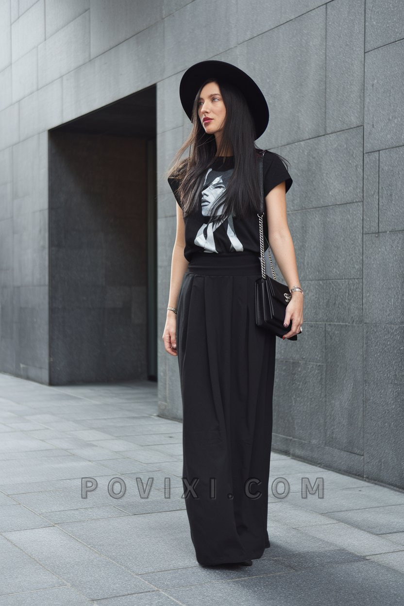 This look takes simple goth to powerful new heights. A long, fitted dress paired with a wide-brim hat and monochrome accessories creates a silhouette that’s both mysterious and elegant. The vampire-print tee peeking through adds an extra layer of personality. Ideal for those who lean toward romantic darkwear but want to keep it casual and wearable for daily life.