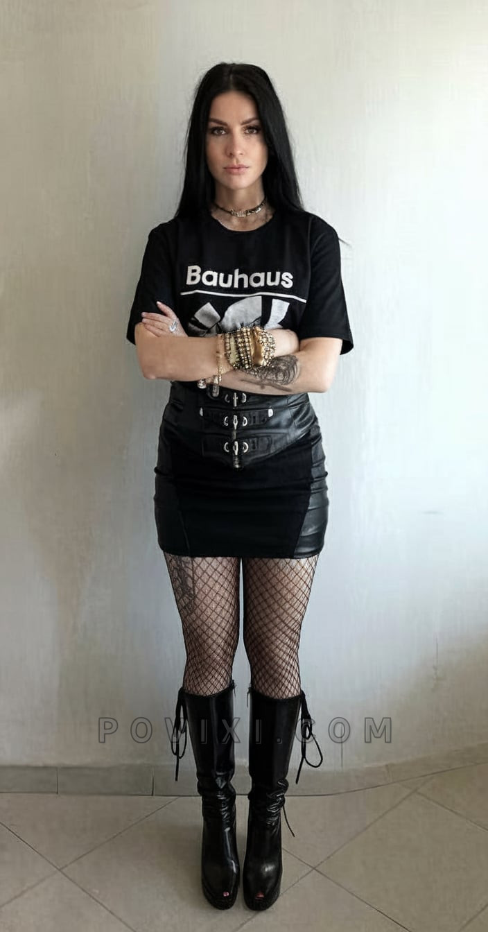 This outfit blends romantic goth with fetish-inspired styling. The chain belt and corset details make this a high-drama look for clubbing or themed events. The daring leg slits, paired with fishnet tights and thigh-high patent boots, exude confidence and sex appeal. If you want to make an entrance and turn heads, this is your uniform. It’s not just fashion—it’s an unapologetic lifestyle.