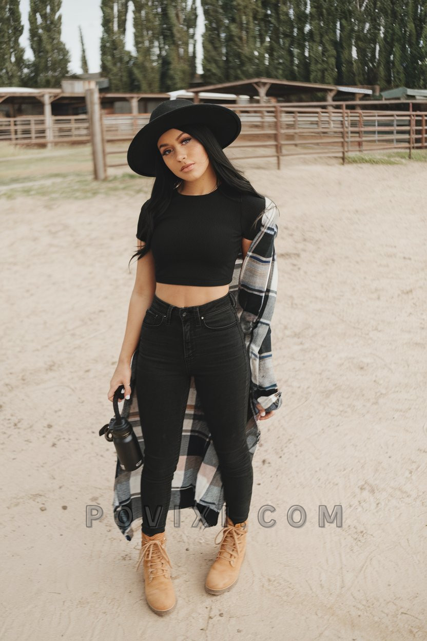 This outfit is a lesson in how to take summer basics and make them unmistakably goth. The oversized black crop top paired with fitted jeans and tan boots adds a rugged contrast. The wide-brimmed hat delivers a boho-gothic energy, ideal for casual hangouts or for school. Add a bit of body ink and a lazy, confident stance, and you’ve nailed a cute grunge-country crossover. A favorite among influencers who mix festival wear with 90s inspo.