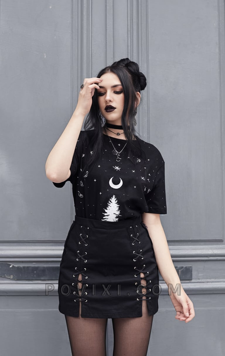 This ensemble balances cute and commanding with lunar graphics and corset-style lacing on the skirt. It’s bold but not overdone—great for school settings that allow expressive fashion, or casual nights out where you want to showcase your personal aesthetic. Add a choker and layered necklaces for that perfect touch of witchy glam.