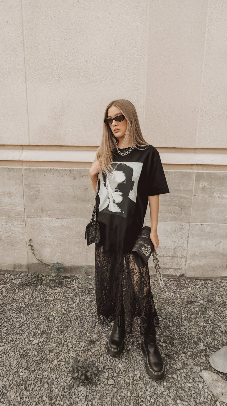 Comfort meets edge in this unique pairing of an oversized Tupac graphic tee with sheer black lace trousers. The see-through lace adds femininity and allure, while the bold tee and platform combat boots give it a grounded, street-smart finish. Accessories like a chain necklace and oversized sunglasses enhance the attitude. This look is a great example of how to mix unexpected textures and elements for a layered, expressive, and fashion-forward result.