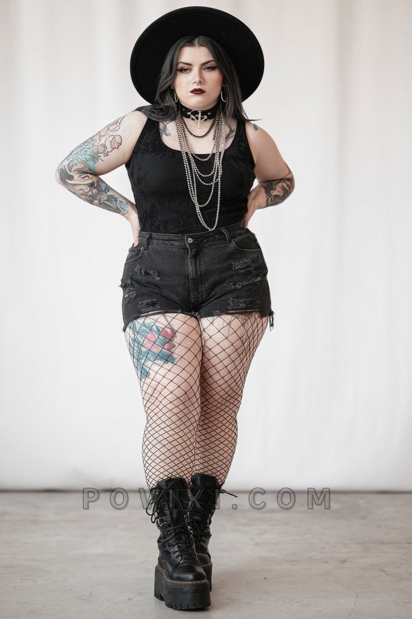 This full-body statement look screams punk glamour. A black tank top with shredded details, paired with distressed high-waisted shorts, creates a strong base. Fishnet tights add texture, while towering lace-up platform boots bring power and height. Chunky chain necklaces and a spiked choker provide classic punk accents, while a wide-brimmed hat and confident pose complete the aesthetic. Tattoos and attitude elevate this into a true modern alt-icon outfit.