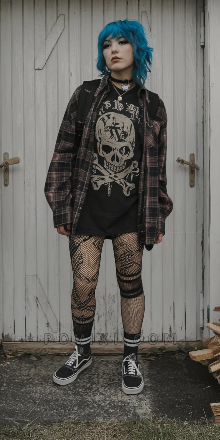 This look screams 90s nostalgia with a hint of DIY punk magic. A vintage band tee, plaid shirt, and distressed fishnet tights come together effortlessly. The oversized flannel shirt acts as a perfect layering piece, keeping it casual yet calculated. This outfit’s vibe is all about nonchalance and musical rebellion. Finish it off with classic Vans sneakers and you’re channeling a youthful, subtle edge perfect for weekend errands or an indie concert.