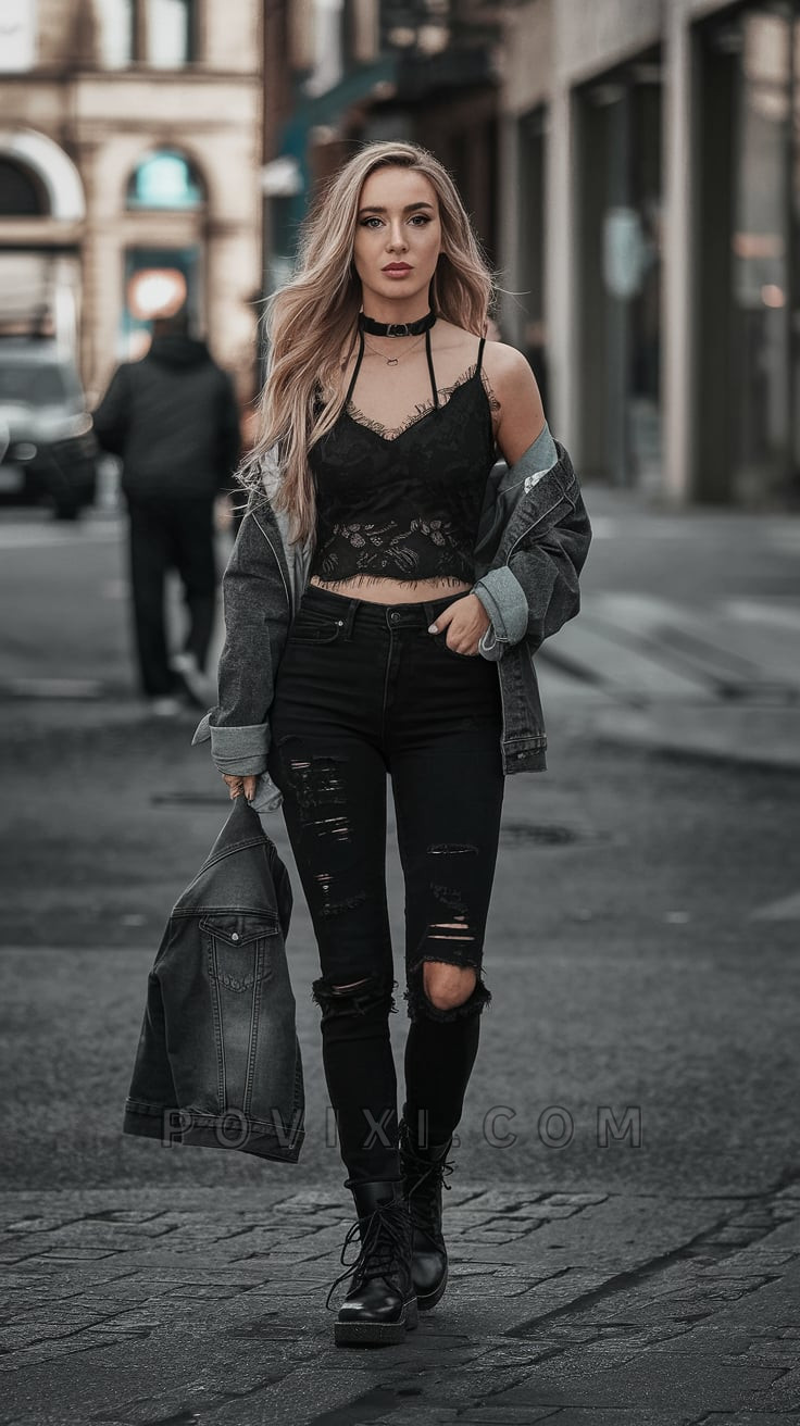 High-contrast elegance defines this style. A black lace crop top paired with ripped skinny jeans creates a flawless silhouette that balances romantic and hot. The oversized jacket tossed over the shoulders gives it that effortless model-off-duty feel. Ideal for a night out downtown or drinks with friends, this look is all about letting your bold femininity shine. Don’t forget a strong lip and lace-up boots to dial up the attitude.