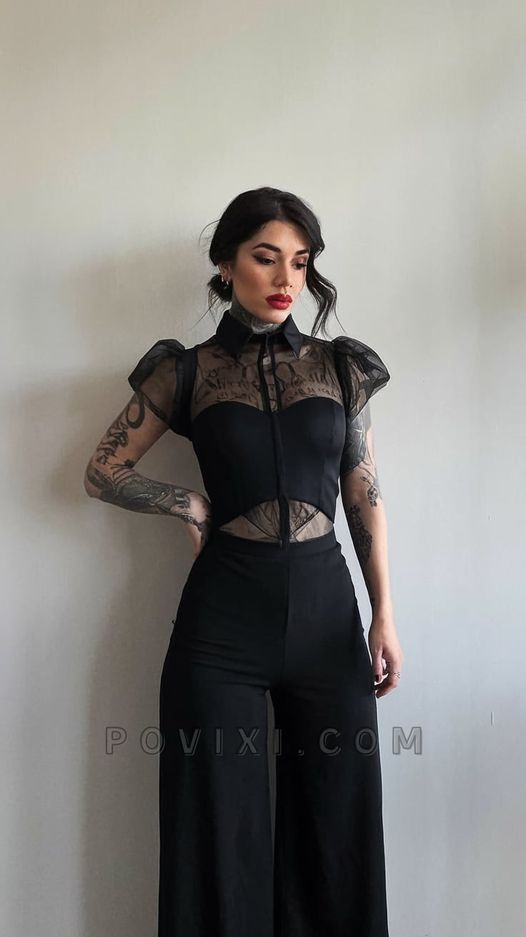 This tailored black jumpsuit layered over a sheer, puff-sleeve blouse is goth grown up. It’s sleek, polished, and ideal for the modern woman who wants to incorporate alternative fashion into her daily life. The sheer paneling adds aesthetic depth, while red lips and visible tattoos bring in unmistakable edge. Great for cocktail hours or fashion-forward offices that welcome personality.