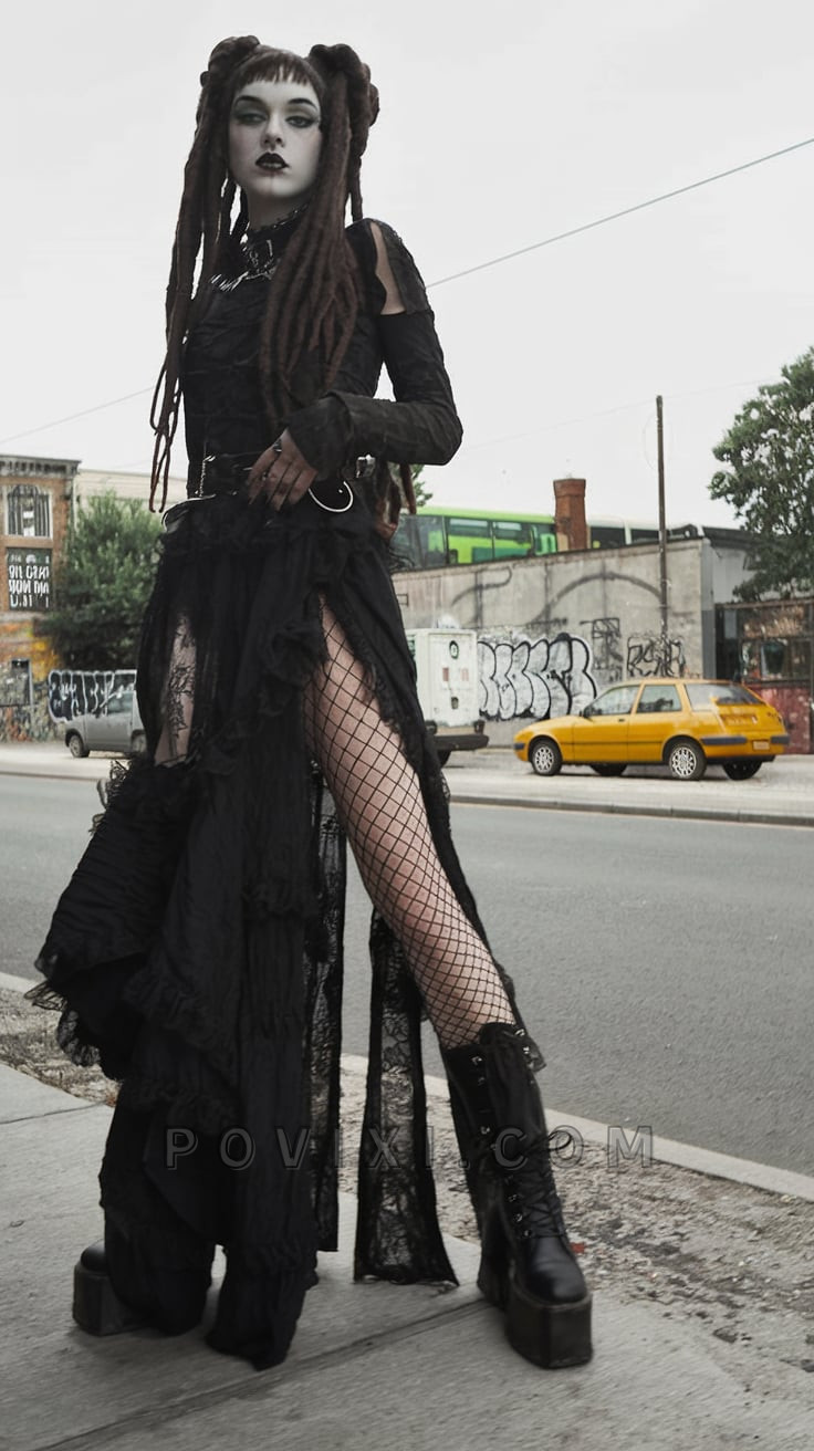 Not for the faint of heart, this grunge-heavy look is an absolute showstopper. Long dreads, dramatic green eye makeup, and a floor-length lace skirt paired with fishnets create a powerful silhouette. Platform boots elevate both the look and the wearer—literally. Add industrial accessories and you’ve got a street-style moment that’s both theatrical and rooted in traditional goth subculture. Think Berlin alleyways or Tokyo’s Harajuku district.