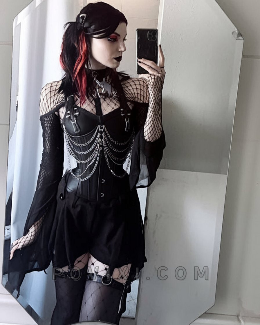 The ultimate goth girl fantasy: netted sleeves, layered chains, and a dramatic skirt with harness details. This look is pure costume-meets-everyday with a strong emphasis on silhouette play. Black lipstick and a pentagram necklace make it ideal for those who live for all things occult. Want to channel aesthetic witch vibes without going full cosplay? This is the blueprint.