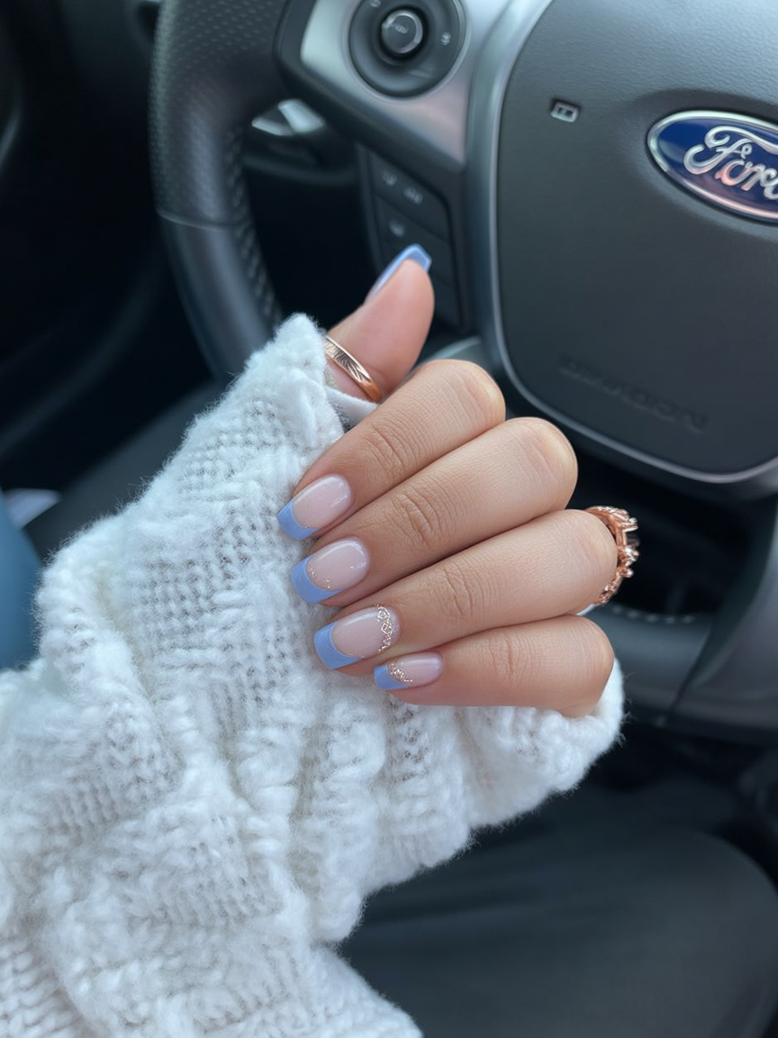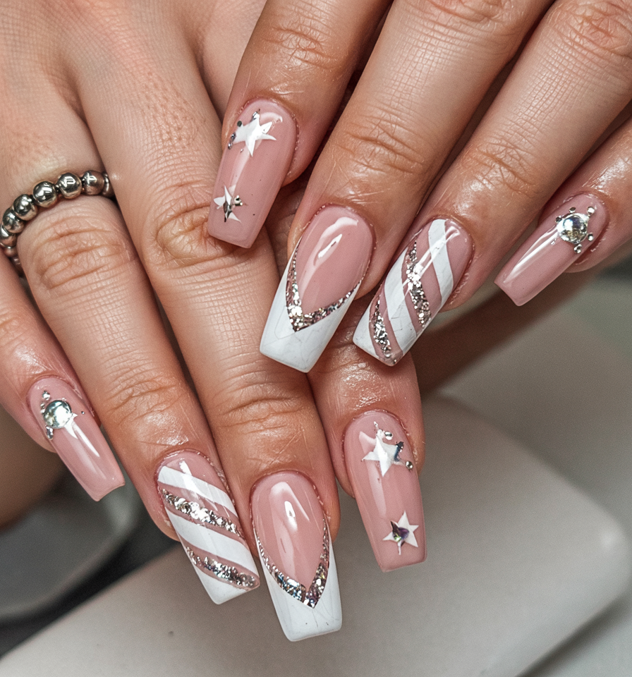 Soft pink meets shimmering white in this elegant twist on French tips, enhanced with silver glitter and star accents. These nails strike the perfect balance between simple and festive, with just enough sparkle to feel celebratory without being overdone. They’re chic, minimal, and timeless.