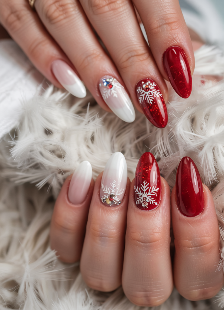 There’s something so timeless about the mix of red and winter white when it comes to holiday nails. This design blends a glossy deep red with soft white tips, finished with delicate snowflake art and a touch of crystal sparkle. The effect is festive yet undeniably chic, perfect for classy holidays where you want to feel both cozy and glamorous. These nails carry that magical balance of bold and simple, reminding you of snowy nights and glowing lights.