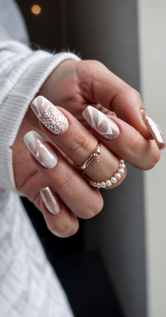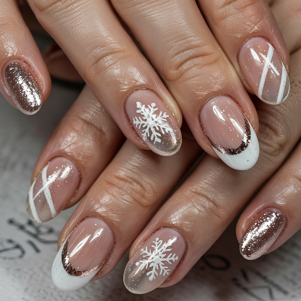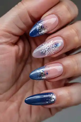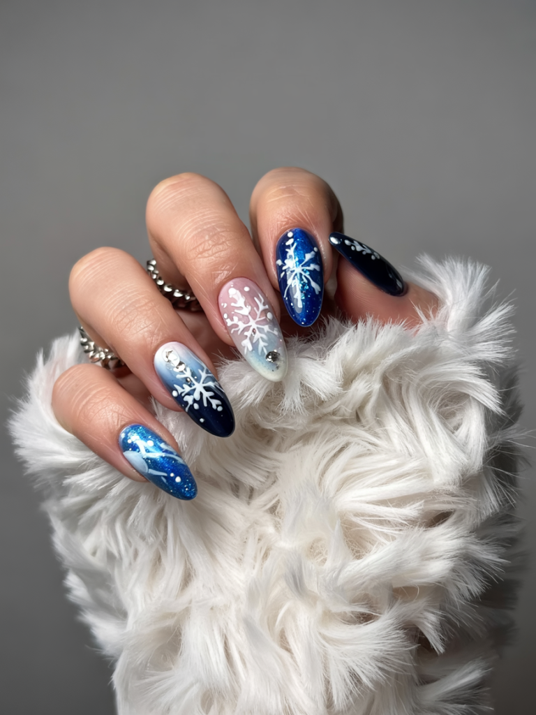 Midnight blue adds that instant depth and class to the kind of snowflake design. Paired with glitter gradients and icy white accents, these nails echo a crisp winter’s night under stars. They stand for elegance with boldness, quite a perfect answer for women who love a wee bit of drama in their holiday style.