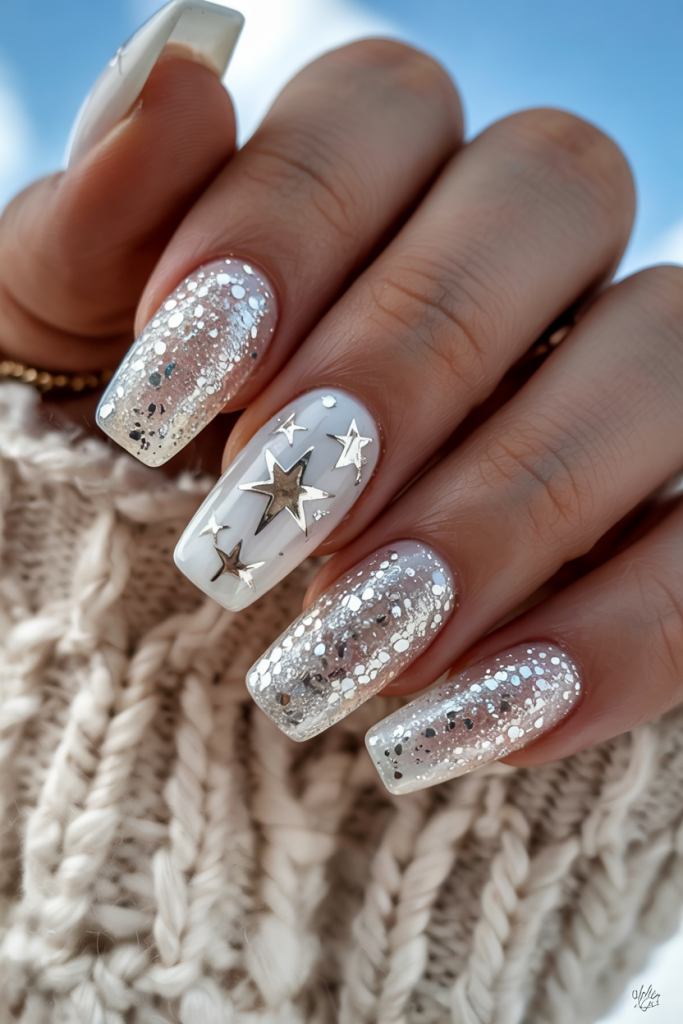 These nails shimmer like a snowy starry night, silver glitter cascading wildly over a pristine white base with metallic stars adding that unexpected dramatisation. The square shape brings a contrast of modern and structured element, while different layers of glitter provide dimension and movement. Festive, regal, and charming-those are what I would choose to describe if anyone wants to treat their nails as jewels during the holiday.