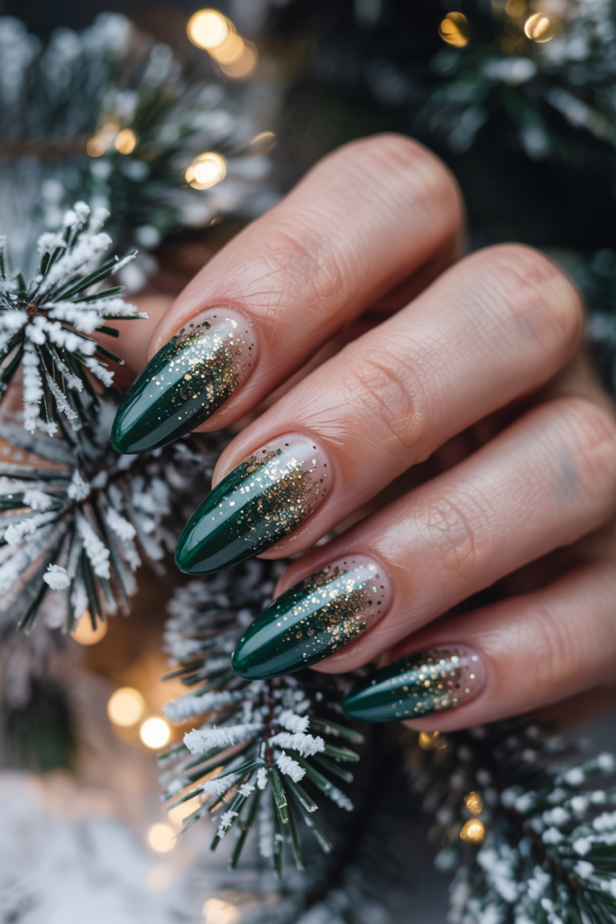 There’s nothing more regal than deep emerald green kissed with golden glitter. These almond-shaped nails embody the rich side of the holiday season—sophisticated yet festive. The gradient glitter feels like twinkling Christmas tree lights, adding both depth and glamour. It’s an elegant design that immediately elevates any winter outfit.