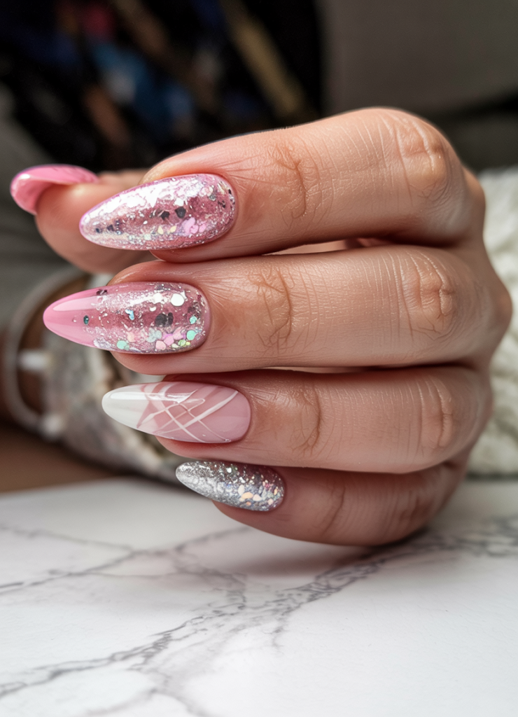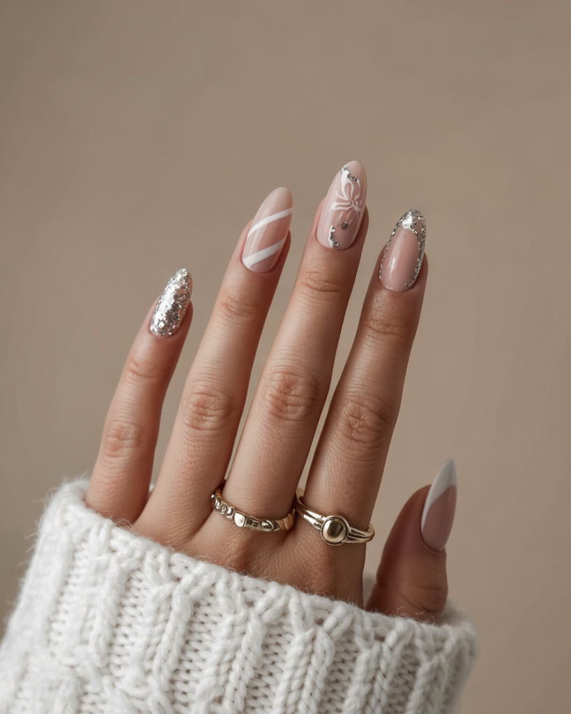 Soft, playful, and festive, these pink glitter nails are perfect for anyone who loves a girly take on Christmas nails. The design features shimmering sequins, silver sparkles, and a soft white accent nail with delicate line art. It’s fun and cute while still being classy enough to wear all season.