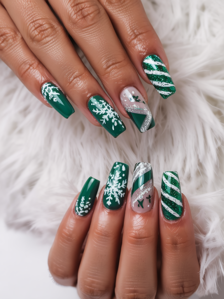 What a playful set this one has to be. It goes with bold green polish and white snowflakes, with striped glittering candy canes. The square shape keeps the design crisp and modern, while the art mix ensures that it is festive yet fun. If you want your nails to feel like holiday decorations themselves, this is just bright, cheerful, and full of spirit.