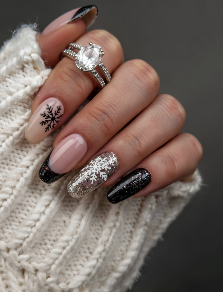 At first glance, the nude polish with black tips, embellished with silver glitters and snowflake accents, provides a crisp yet elegant contrast. The mixture of shimmer and matte tones renders this manicure classic without veering into conservative territory, absolutely in line with that woman who wants her nails perceived as distinct and edgy, yet elegant.