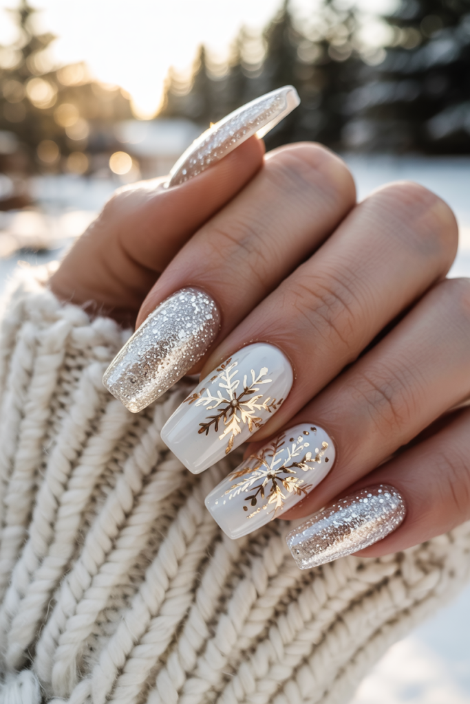 These nails are pure elegance, white, silver glitters, and golden snowflakes lighting up into the winter. The square shape makes them elegant and structured, while metallic accents sparkle with festive elegance, just perfect for holiday parties.