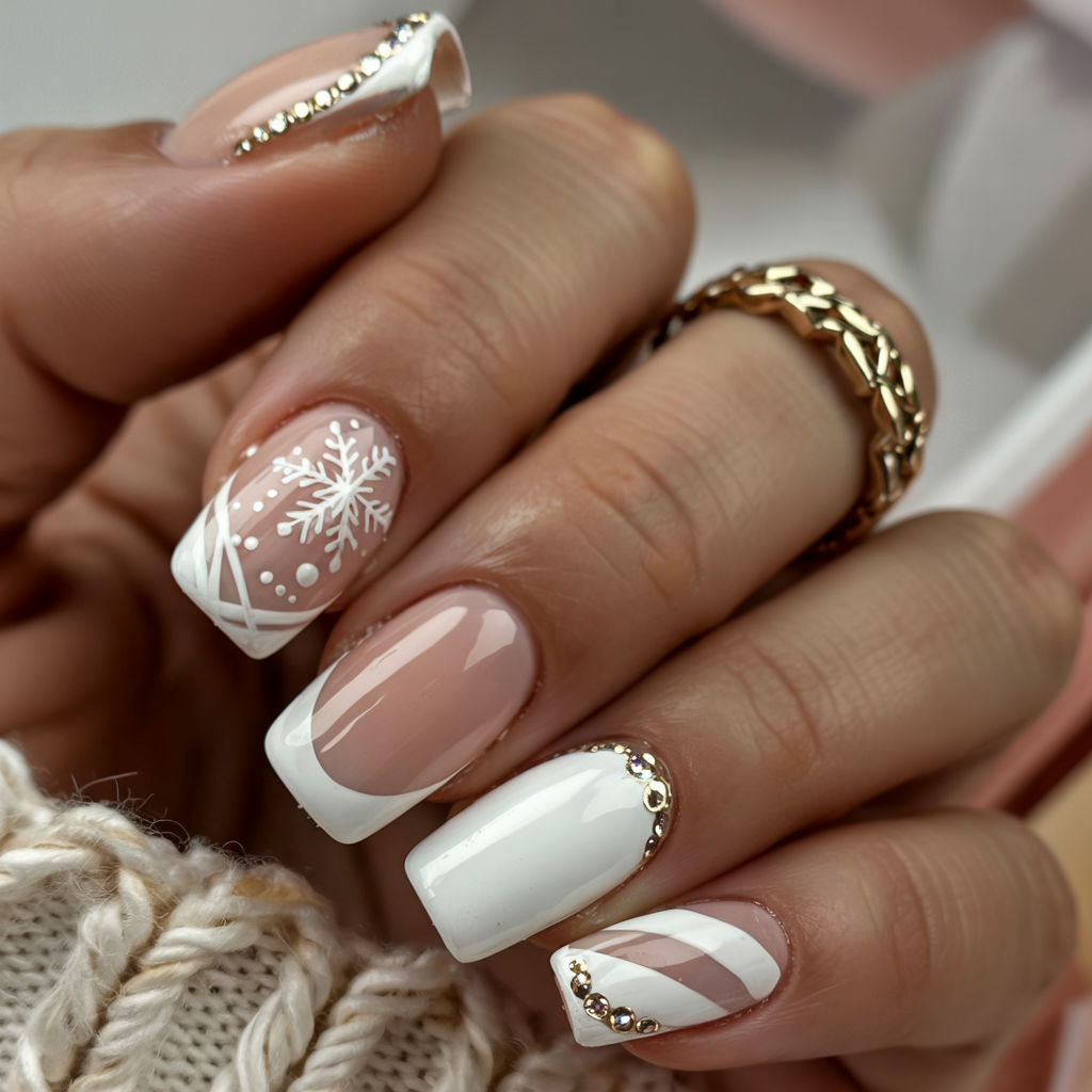 For women who prefer something polished and understated, these elegant square tips with crisp white edges bring a fresh and simple holiday vibe. The snowflake accent art adds a touch of seasonal magic without overpowering the design, while the rhinestone details at the base provide just the right amount of classy sparkle. This look captures the quiet beauty of a winter morning, soft yet striking.
