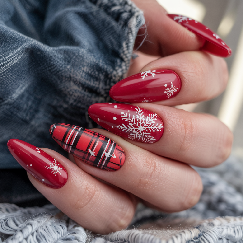 Red nails are a canvas for creativity: fashion snowflakes with a plaid accent. This feels warm and traditional yet modern-the weaving of cozy patterns and festive colors. That kind of look that just puts you in the holiday spirit, evocative of flannel scarves and Christmas mornings.