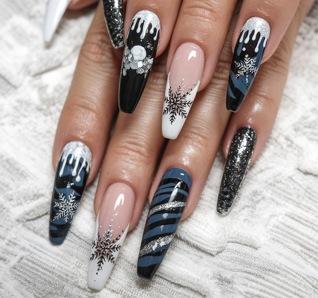 These nails feel like a snowy night under starry skies, with black and navy drips interrupted by silver snowflakes and icy glitter. The long stiletto shape is dramatic, while the layered design renders every nail in another tiny winter scene. The design is bold, edgy, yet elegant; choosing it would suit a gal who opts for the darker alternative to the holiday look.
