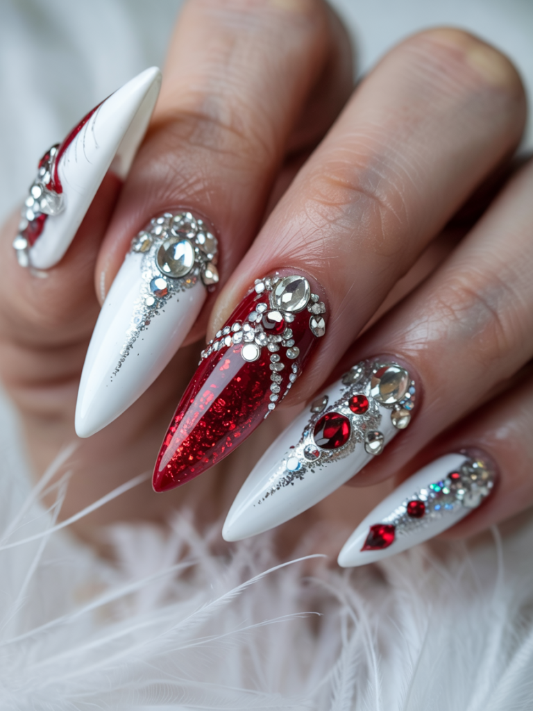A calendar holiday nail is also jewelry-so you know it is a showstopper! Full of gemstone, rhinestone, and glitter, these white and red nails have a luxurious and elegant vibe. They’re shining, loud, and classically sparkled with ruby.