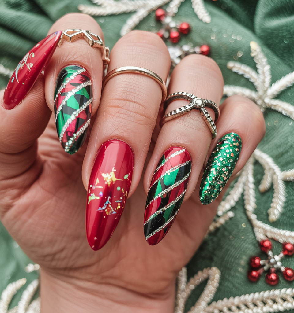 These nails unite classic holiday colors–red, green, and glitter–into a chic argyle-inspired pattern. The variety of designs and sparkles creates a playful yet elegant style that embodies warmth and presents a festive feel for anyone who favors traditional hues with a modern twist.