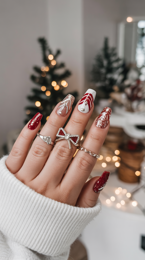 Playful yet polished, these nails bring together nude tones, candy-cane stripes, glitter, and delicate bow accents. It’s like unwrapping different holiday surprises with each nail, yet the neutral base keeps it elegant. The result is a design that feels celebratory but still classy—fun without being too loud.