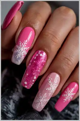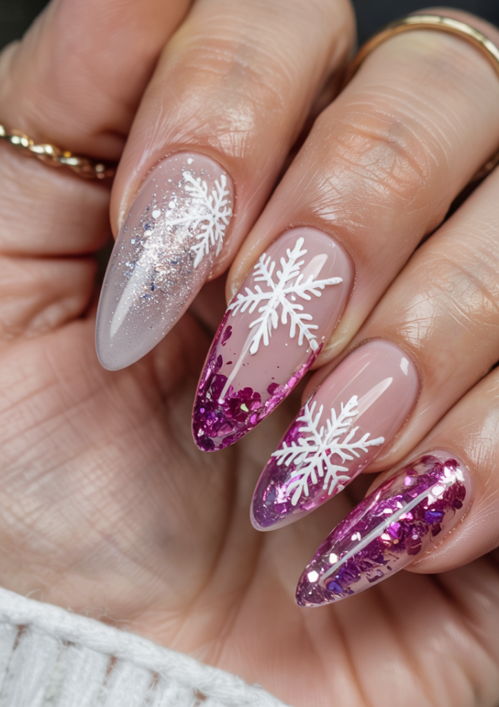 Who says Christmas nails have to stick to red and green? These pink frosted nails bring a playful twist to the holiday season with soft rosy tones and bright snowflake accents. A touch of glitter adds dimension, giving that frosted-window look that’s both cute and classy. They’re sweet, feminine, and perfect for anyone who wants to step away from tradition while still embracing festive charm.