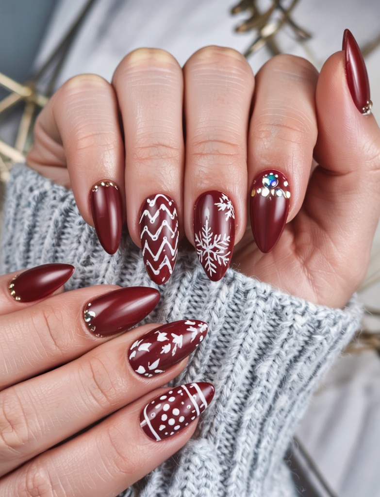 There is a certain richness that burgundy nails can bring to the scene, and with the detailed snowflakes, dots, and chic patterns, there is just so much winter elegance in the air. The mix of matte and glossy finishes includes a few gold accents and some jewels that sparkle like festive lights. It lays a bit of boldness without shining too much, giving warmth just right for a classy holiday spending by the fireplace or at a stylish dinner-time affair.