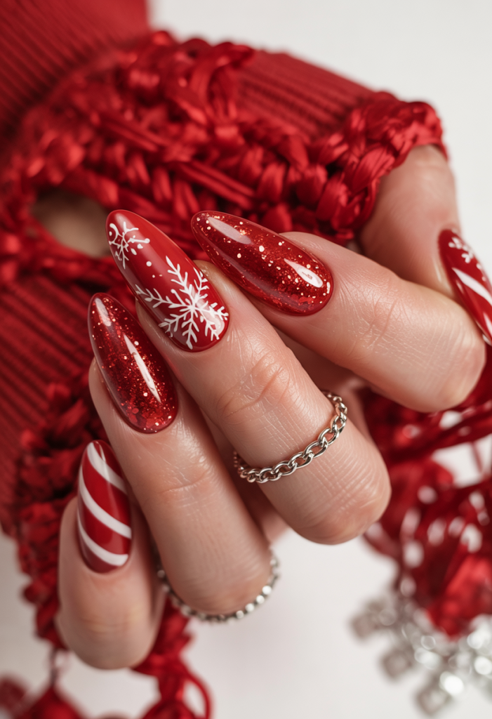 This manicure brings all holiday cheer-red shimmer stripes contrasting with candy cane stripes and delicate snowflake art. The glossy almond shape balances between classy and fun; basically, designs that make you want to wrap presents with hot cocoa in your hand. Bold, festive, and full of personality, it befits every single classy holiday sparkle we ever dreamt about.