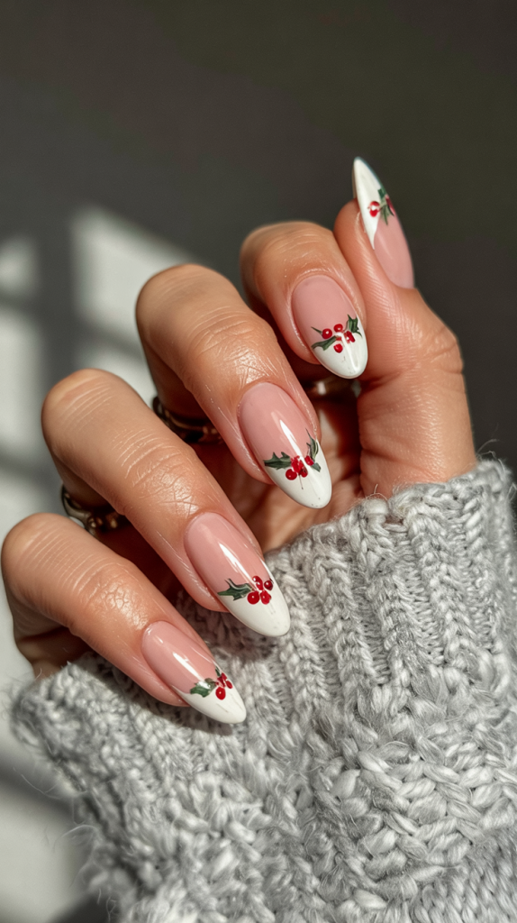 Sometimes beauty lies within the simplicity, and these soft almond nails are here to prove it. A pale nude base blends seamlessly into crisp winter white tips that are accented by miniature holly berries and little green leaves. It’s a bit of a subtle nod to Christmas-y days without feeling too much, and it’s perfect for women who love the understated beauty enhanced by a touch of holiday art.