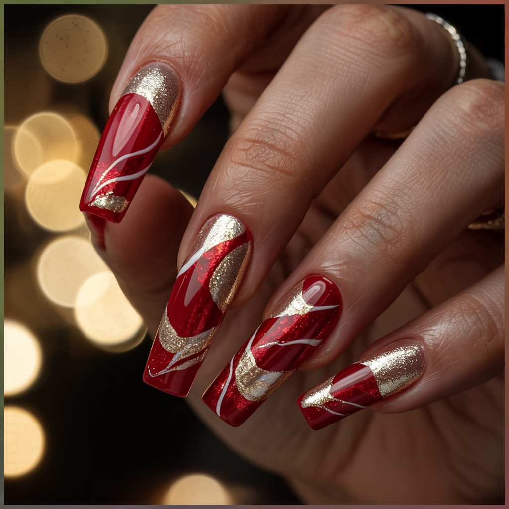 Pure glamour for your Christmas season – these nails are the answer. The bold red swirls meet shimmering gold for an equally luxurious and attention-grabbing design. The long square nails add a whole extra level of drama, so under glittering lights in a holiday dress, these are simply let loose.
