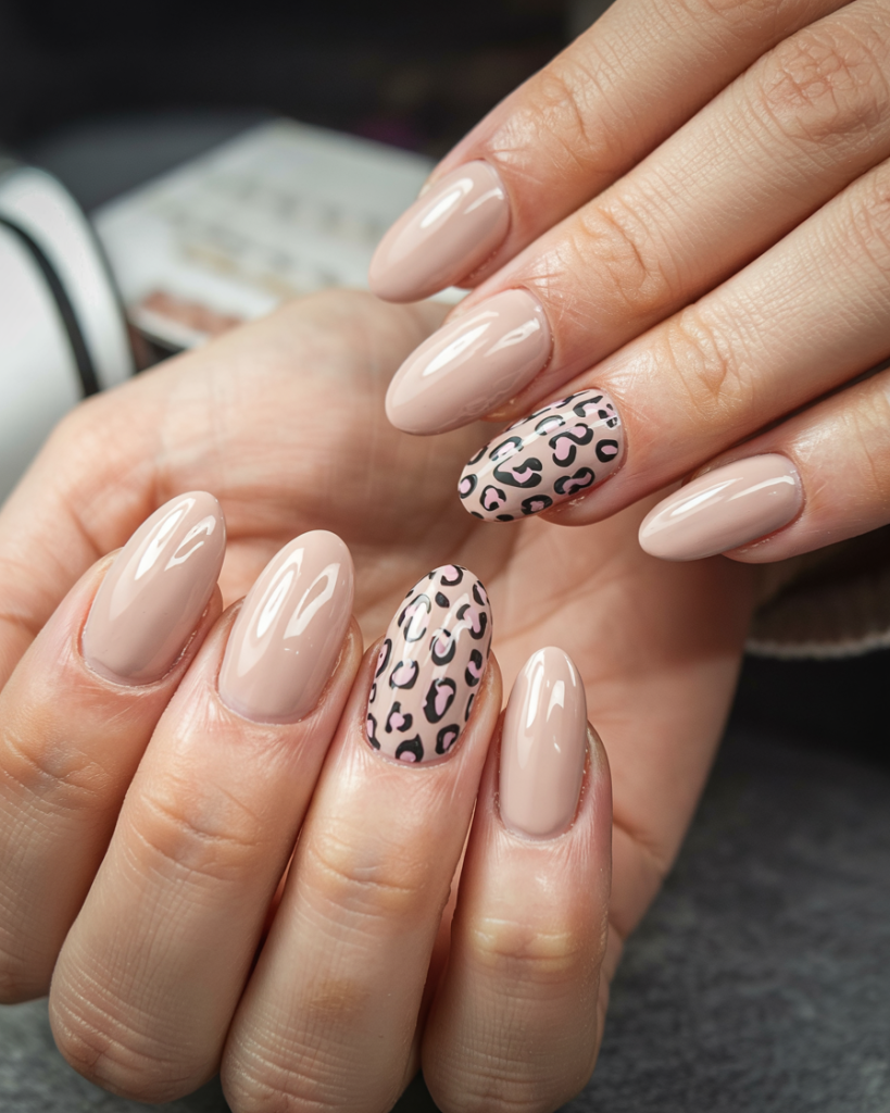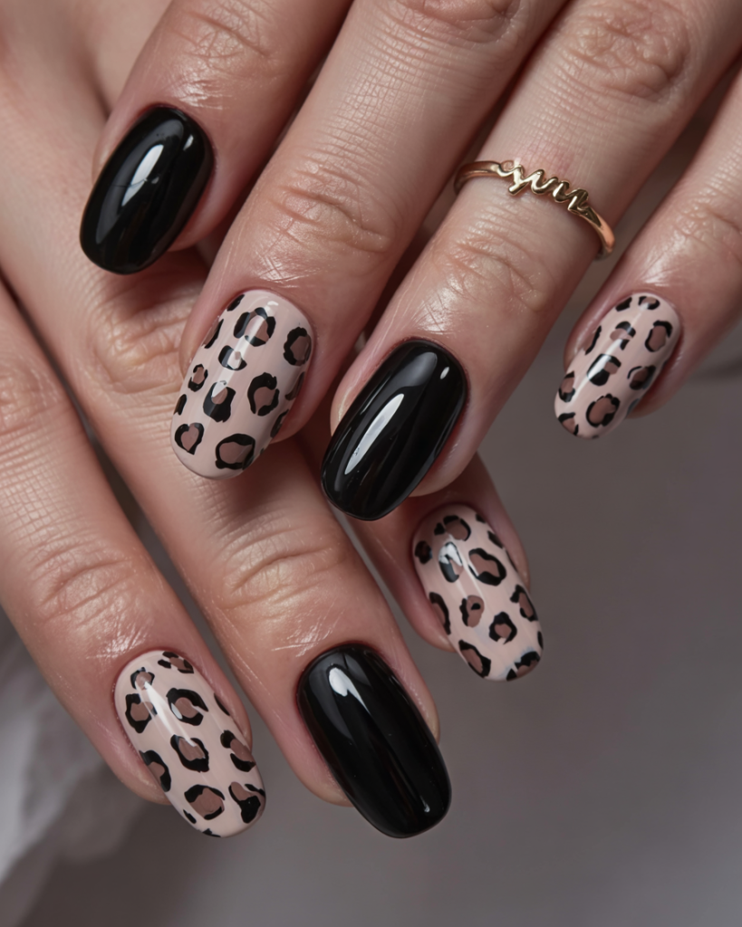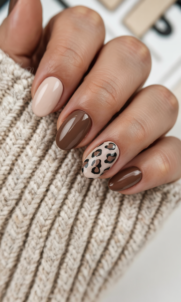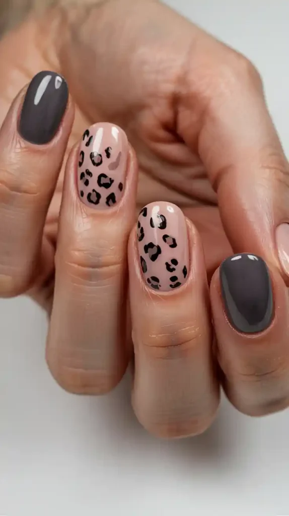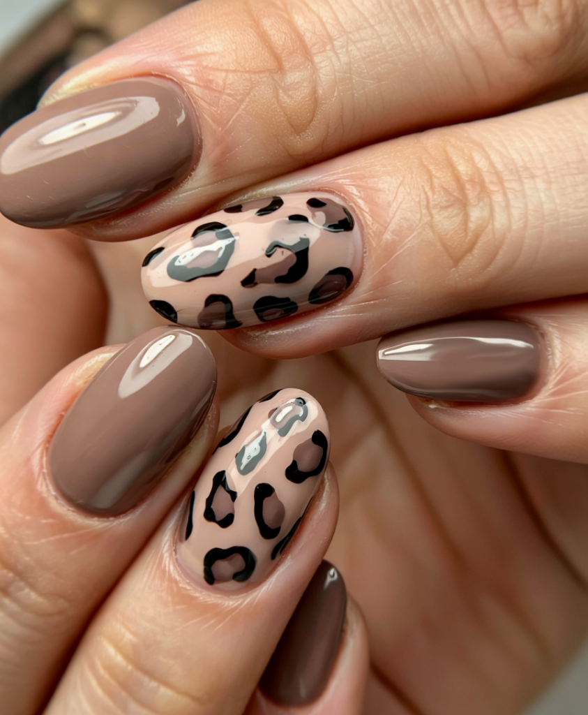Not dull and definitely not dull, this look fools with contrast in the trendiest manner. A combination of soft taupe and black is beautified immediately with two flashy cheetah print nails, so this mani is neither too flashy nor too trendy. These are fall cheetah nails 2025, which suit those women who like to have just a little wildness behind the masks of sophistication.