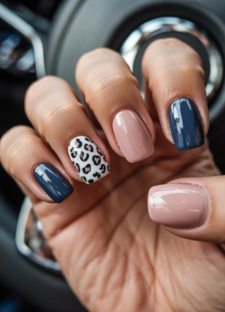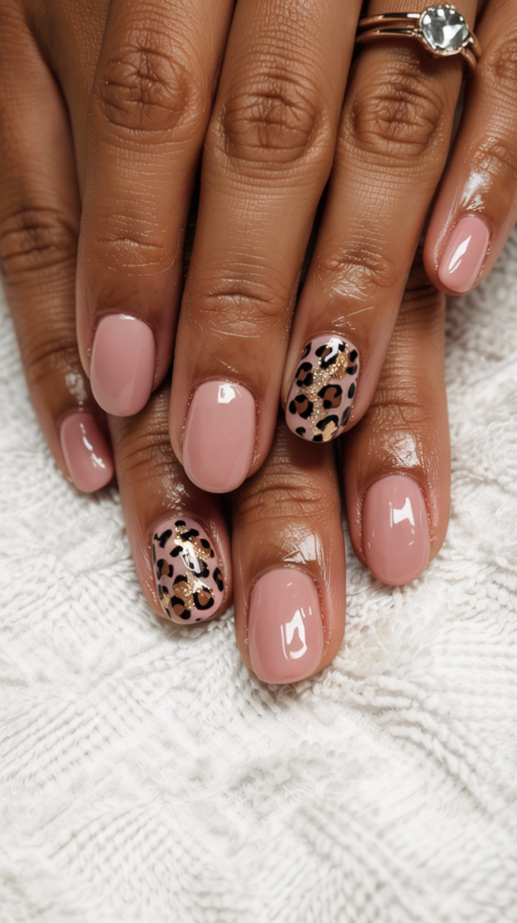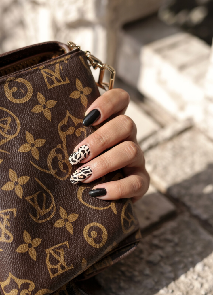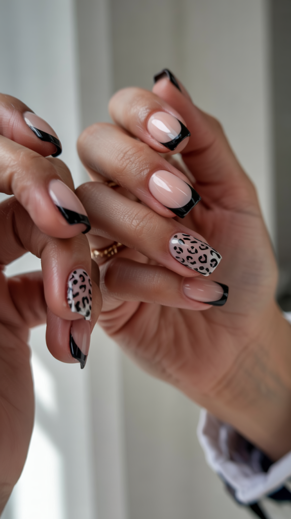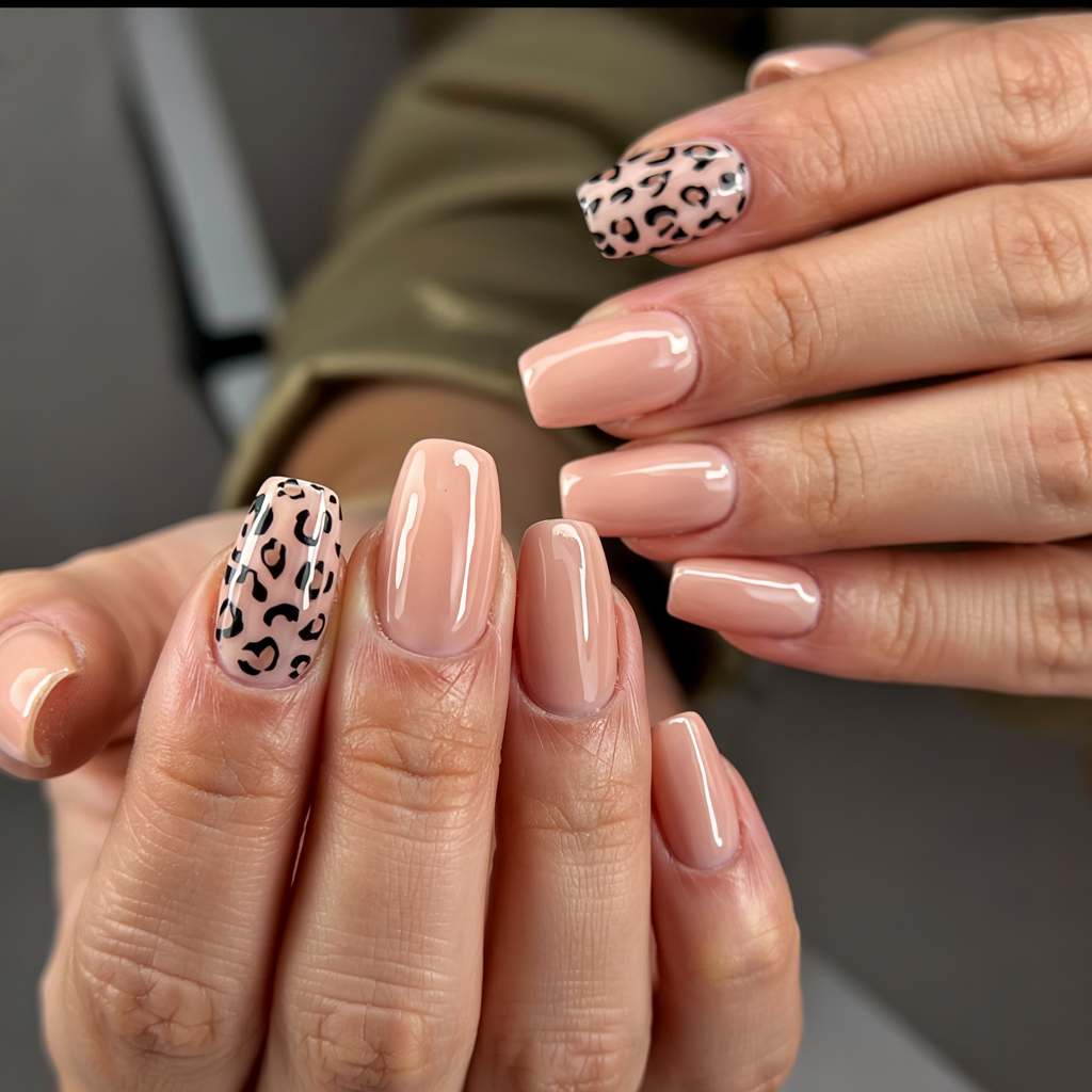 Not dull and definitely not dull, this look fools with contrast in the trendiest manner. A combination of soft taupe and black is beautified immediately with two flashy cheetah print nails, so this mani is neither too flashy nor too trendy. These are fall cheetah nails 2025, which suit those women who like to have just a little wildness behind the masks of sophistication.