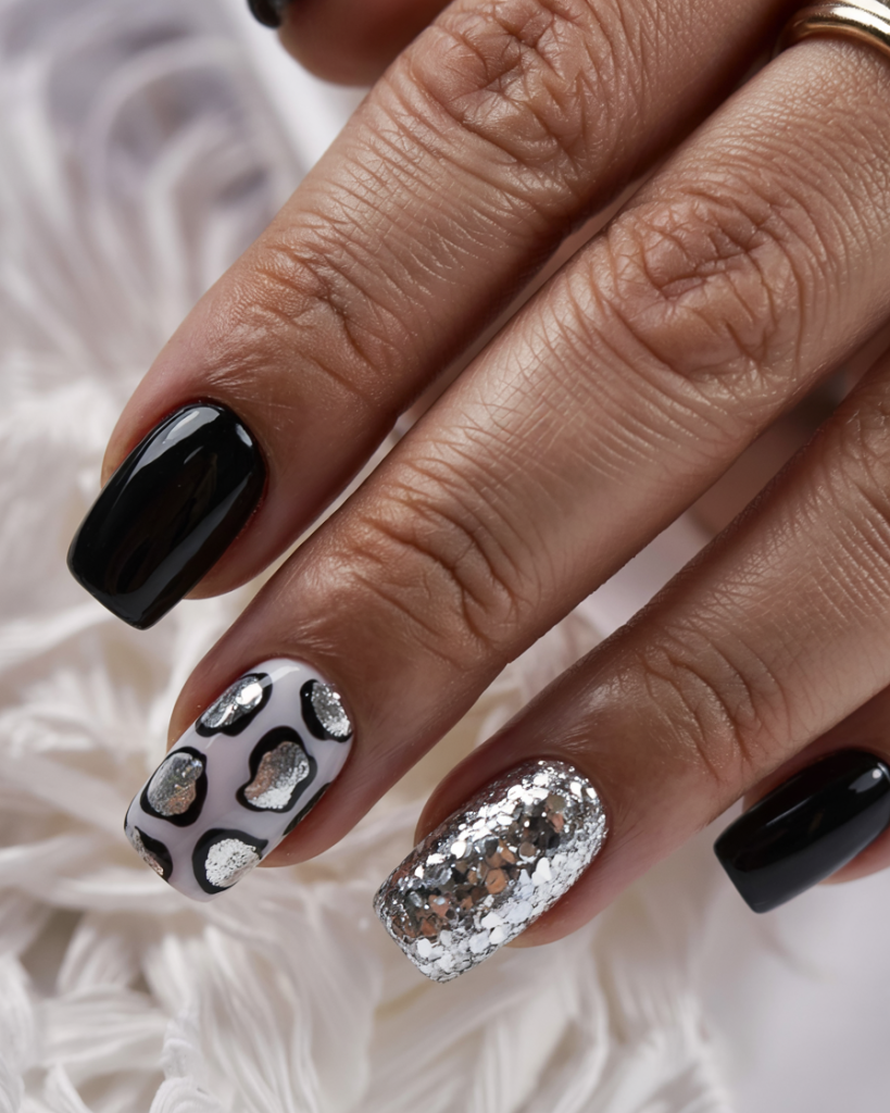 This one is for the bold glam girls. High-shine silver glitter meets high-contrast cheetah spots for a look that says “holiday party ready” even if you’re just running errands. These fall cheetah nails 2025 are attention-getters and eye-candies to every room.
