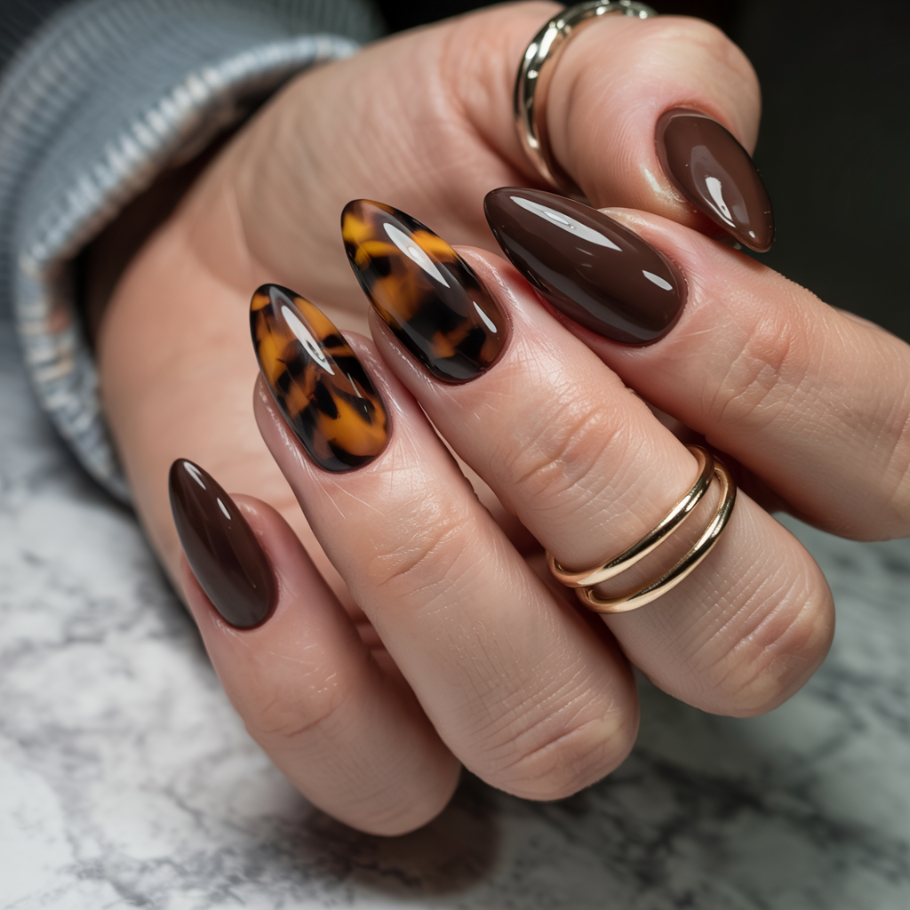 Perfect when you want the dramatic nails, but not to have chatty colors, almond would be the best shape to complement your hands, and the tones of brown and amber will flatter every skin tone. If you want something subtly exotic and fashion-forward, this one’s a gem.