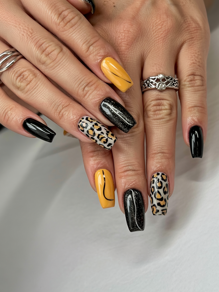 This set practically roars with personality. The combination of bold yellow, traditional black, glimmering accent nails, and achee cheetah prints constitute a combination that is fearless, fierce, and a fall gust of attitude. These fall cheetah nails 2025 are the cool big bro of a pumpkin patch that are well dressed and confident.