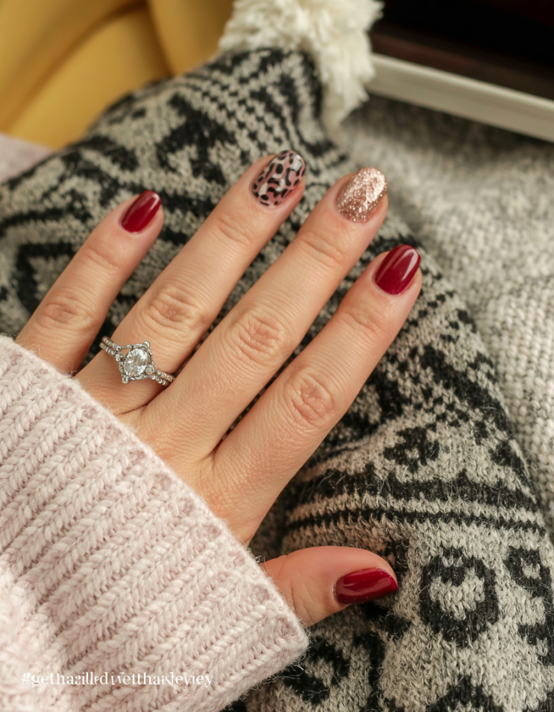 Talk about cozy-glam goals! The combo of rich burgundy, rose gold sparkle, and those slight cheetah pattern accents adds up to that fall leaf sweater on nails. These fall cheetah nails 2025 adds some warmth, demeanor, and touches of sparkle to lighten a gray fall day.