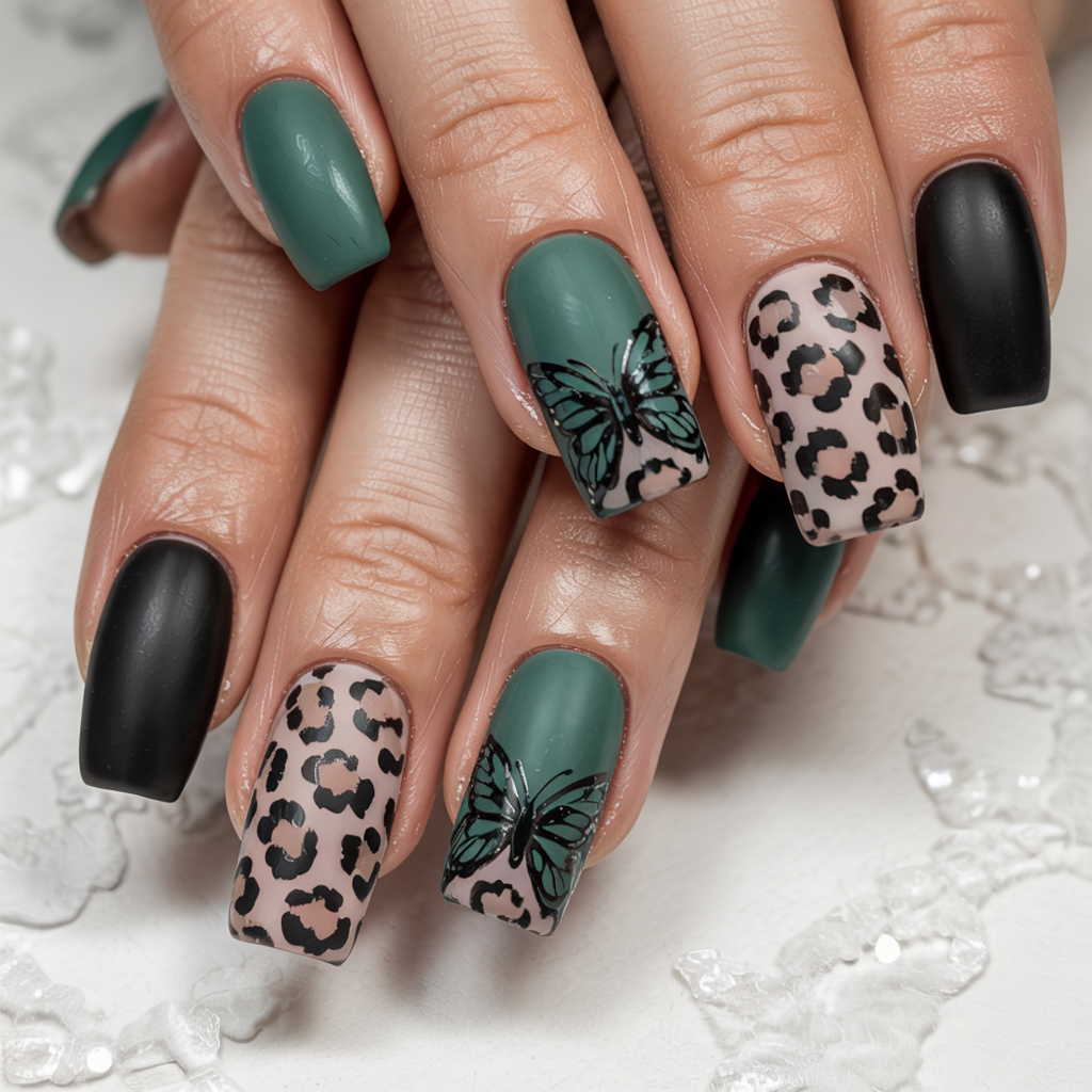 Edgy meets enchanting in this lush jungle-inspired set. Matte green and black look amazingly good with contrasting cheetah spots as well as butterflies. These Fall cheetah nails 2025 are just like the wild beauty of nature in a single pack of mad crazy nails that are bound to turn people on.