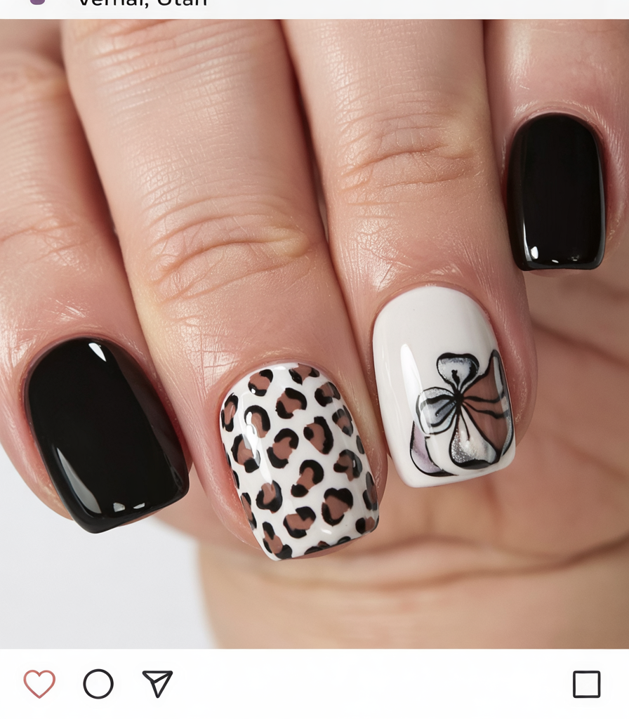 This design adds some retro glamour to the wild side. The contrast of black, white and cheetah pattern is spectacular but balanced as well, and a light floral finish is used to neutralize the entire outfit. These fall cheetah nails 2025 are not only edgy but feminine at the same time, like a jacket made of leather and a dress made of silk.