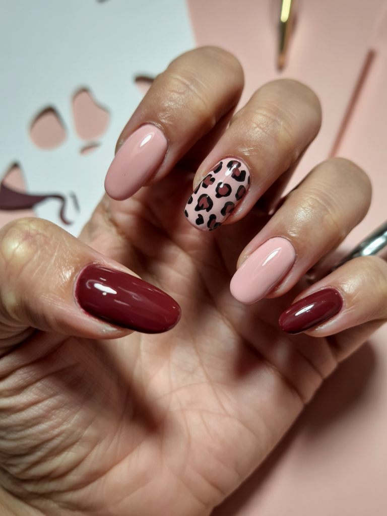 These nails may be sweet without being too soft, the like of a warm fall sweater as a manicure. They are a set of muted pink colors with lush burgundy accents and a loose cheetah print: this is an ideal choice to wear during the frosty morning hours of autumn and go on a trip to get pumpkin spice to warm yourself. These fall cheetah nails 2025 have a nice fierceness to them that is completely wearable.