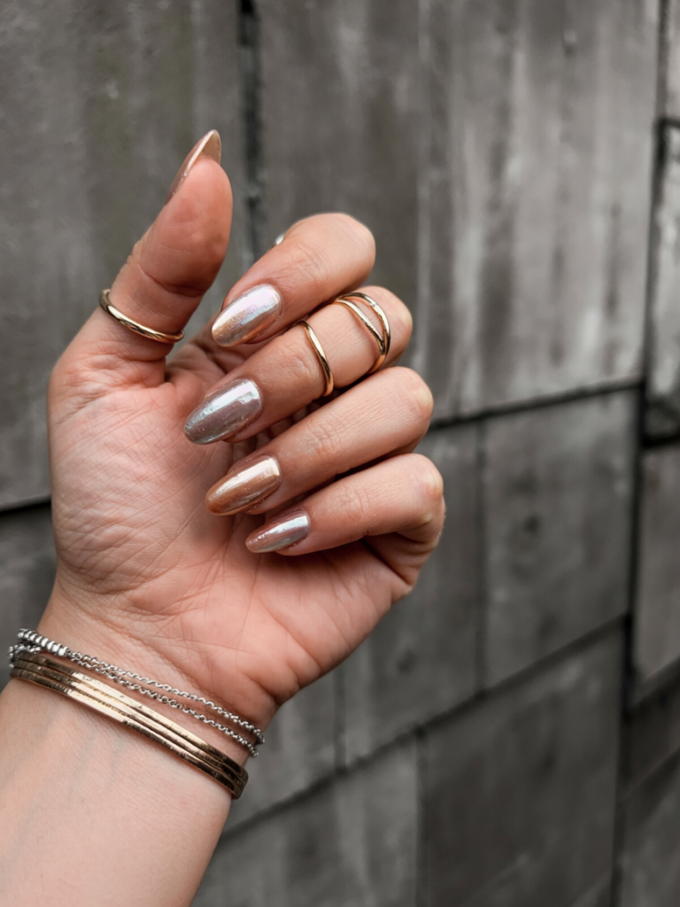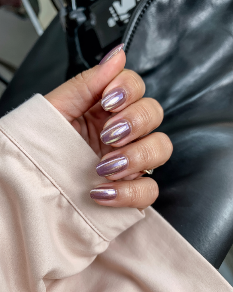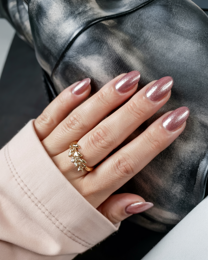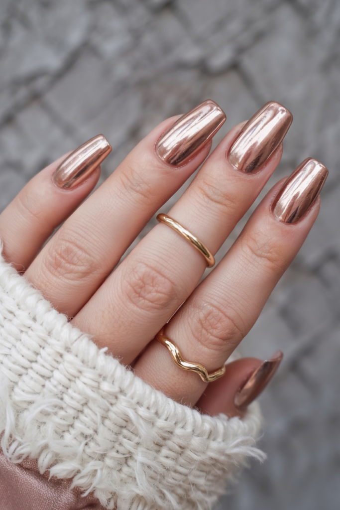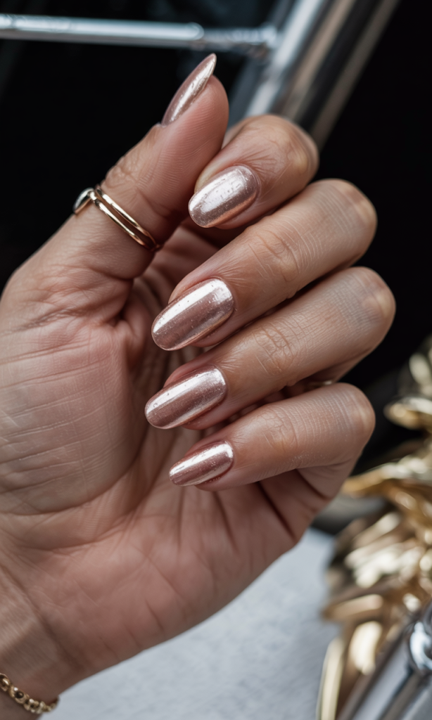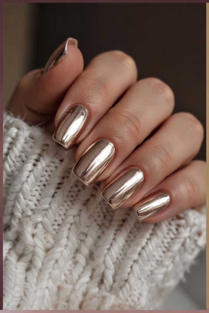 It is an ultra-reflective champagne chrome, which is a champagne drink on your nails, crisp, festive, and very suitable during the upcoming colder months. It follows that sparkly air that makes even your comfiest sweater feel fancy.