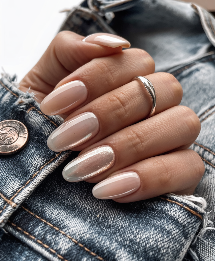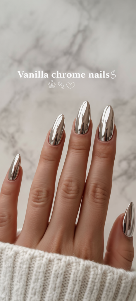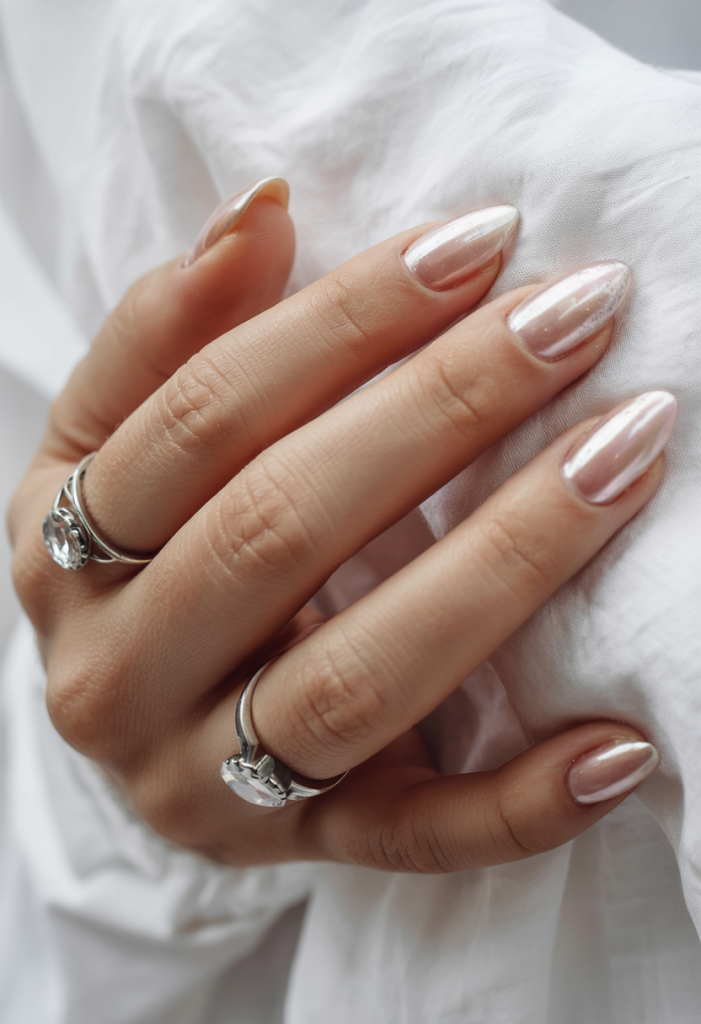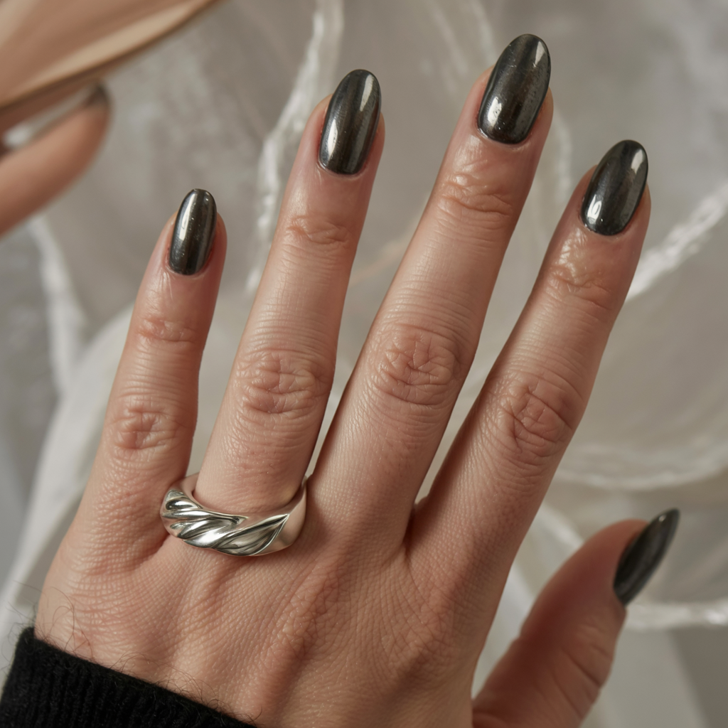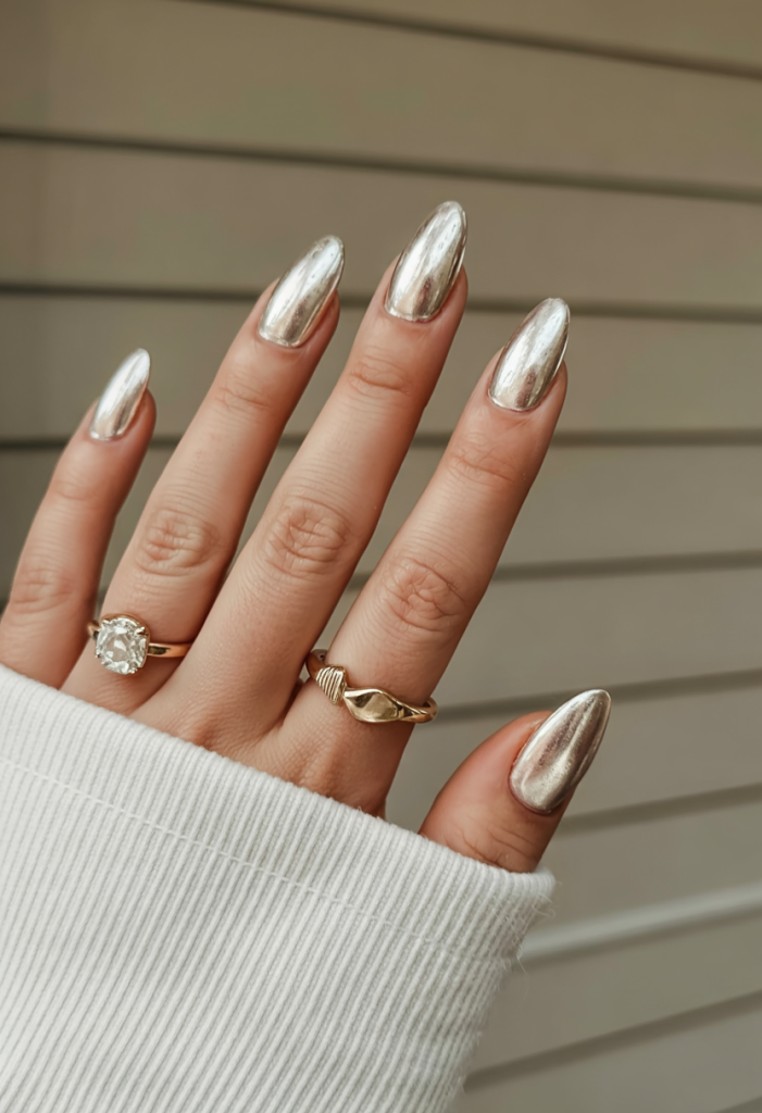 It is an ultra-reflective champagne chrome, which is a champagne drink on your nails, crisp, festive, and very suitable during the upcoming colder months. It follows that sparkly air that makes even your comfiest sweater feel fancy.